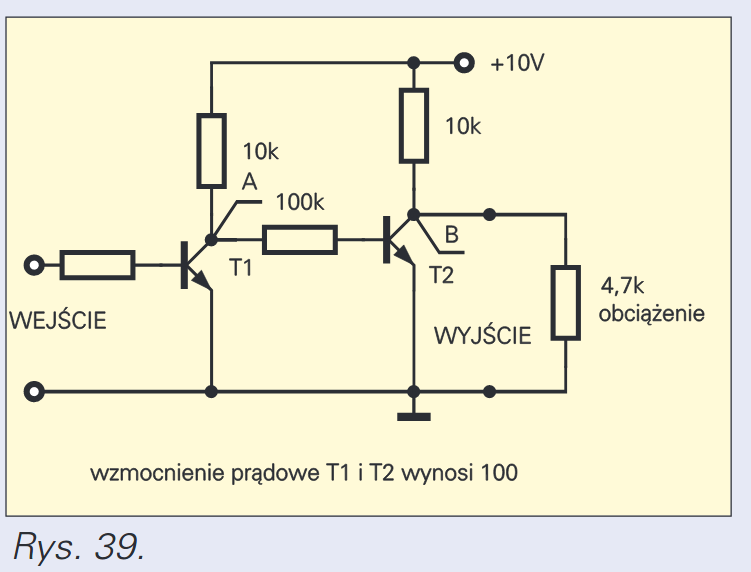 pytanie odnośnie obwodu załączonego na obrazku - obwód taki ukazał się w 5. części kursu "Tranzystory dla początkujących" w czasopismie Elektronika dla Wszystkich (nr 5, rok 1998: https://elportal.pl/pdf/k01/29_12.pdf). Zadanie polega na wyznaczeniu napięcia w punktach A i B obwodu przy założeniu, że napięcie wejściowe wynosi 0 i 10 V (rozważyć dwa przypadki). Wzmocnienia prądowe obydwu tranzystorów wynoszą 100. Napięcie baza-emiter przyjąć jako 0,6V. Rozwiązałem to zadanie, tylko odpowiedź dla przypadku z zerowym napięciem wejściowym nie zgadzała mi się z odpowiedzią zamieszczoną w artykule - napięcie w punkcie A wyszło mi 9,145 V a w artykule jest podane 1,45 V. Obliczyłem to korzystając z napięciowego prawa Kirchoffa idąc od zasilania +10V przez rezystory 10k i 100 k, obwód baza-emiter do masy. Czy odpowiedź podana w artykule jest poprawna? Jeśli tak to gdzie popełniłem błąd?