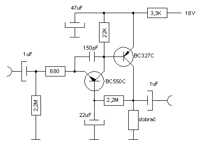 • drugi stopień wzmocnienia: tranzystor PNP, w układzie wspólnego emitera.
