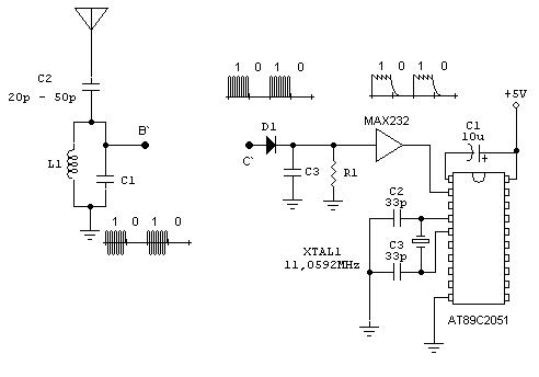 Teraz odbiornik, obwód wejściowy dostrajam do takiej samej czestotliwości czyli f=x, aby wyłapać z anteny prąd o takiej częstotliwości jaką chce(i tylko tą nie obchodzi mie dobroć i pasmo tego obwodu, bede wyłapywał jedynie f=x, żadego +/- 3kHz) sygnał jaki jest na wykresie powyżej idzie do wzmacniacza w.cz, a następnie przetważam go w detektorze(bedzie oparty o diodę półprzewodnikową), dioda zachowa sie jak mostek, więc przepuści mi jedynie dodatnie połówki sygnału zmiennego ze wzamcniacza w.cz. Dodatnie połówki(lekko odfiltruję) gdzie prąd płynie to będą moje jedynki, a gdy prąd nie płynie to będą zera. teraz wystarczy wzmocnić lekko ten sygnał jakimś tranzystorkiem(albo może anwet dać max232, tylko nie wiem jak on dokładnie tam wzmacnia ten sygnał) i podać na RxD odbiornika. Taką miałem pierwotnie koncepcje.