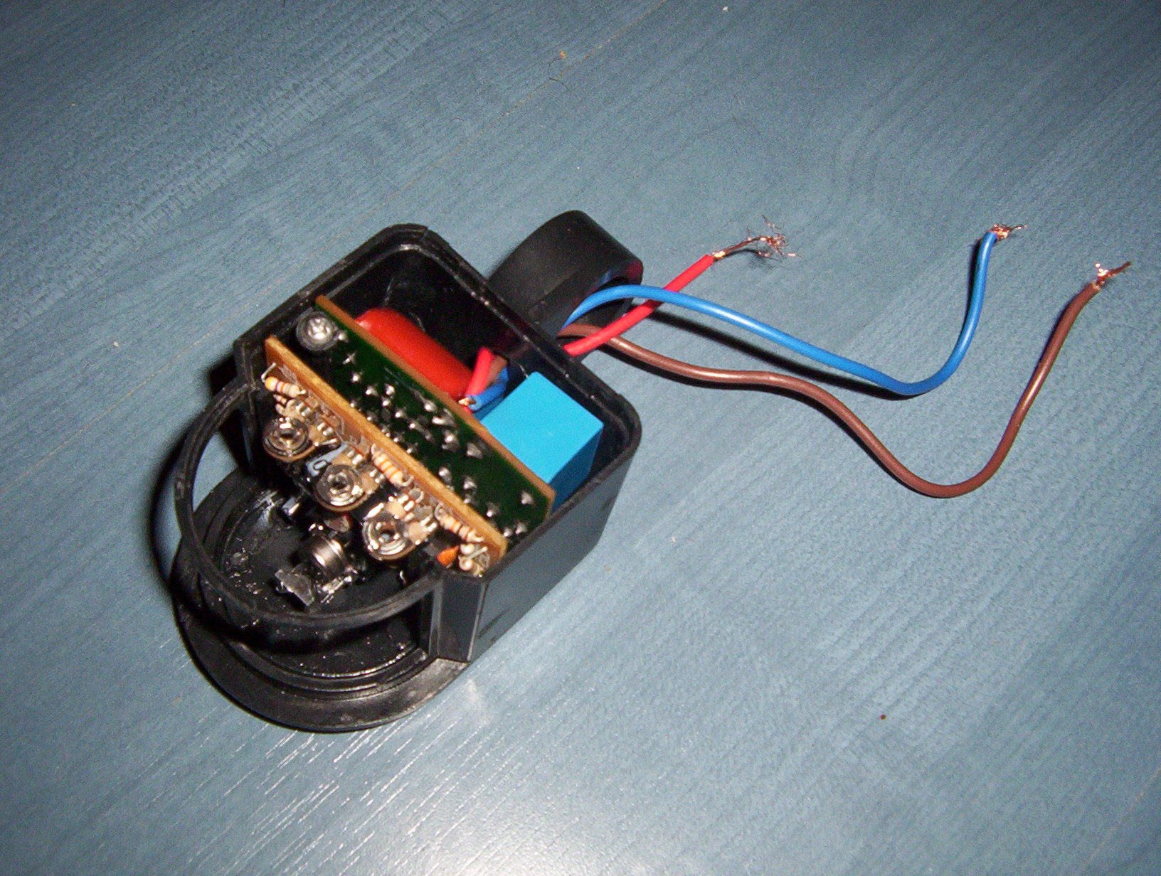 :) Jesli sie nie myle to brazowy bedzie faza (230V) niebieski zero a czerwony to wyjscie na zarowke oczywiscie zeby zarowka swiecila musisz tez na zarowke podac zero. Najlepiej sie zorientujesz jesli sobie rozrysujesz jak ida przewody po plytce :idea: to niebieskie wyglada na przekaznik i jesli z jego stykow wychodzi ten czerwony nigdzie nie podlaczony to moge sie podpisac pod moja teoria :wink: