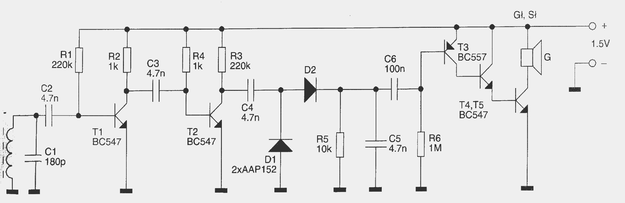Poniżej przedstawiam schemat odbiornika AM. Znalazłem go gdzieś w Internecie, podoba mi się, bo jest na 1,5V. Postanowiłem go urzyć. Jednak widząc prostotę ów układu nie mogę uwierzyć, że będzie on dobrze oddawał sygnał odebrany. Mam na myśli polaryzację tranzystorów. Nie mam zbyt dużego doświadczenia z tranzystorami, ale wydaje mi się, że cały odbiornik będzie bardzo nieliniowy(najbardziej razi mnie ten układ kaskadowy na końcu). Pomyślałem sobie, że jeśli nie bedzie się nadawać do gitary(ale nadal czekam na wasze opinię) moge go urzyć do np. komunikacji pomiędzy dwoma komputerami przez porty comm(albo USB, ale nie znam budowy i działania, więc nie uwzględniam go).