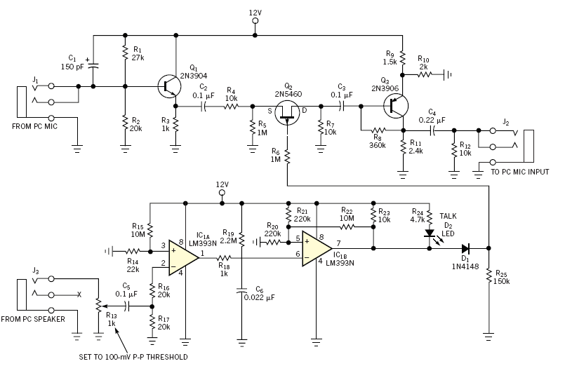 Zbudowanie takiego układ eliminuje powstające echo podczas rozmowy np SKYPE i innych komunikatorów internetowych. Do układu doprowadza się sygnał z używanego mikrofonu oraz sygnał z głośników. Przystawkę podłączamy do wejścia mikrofonowego karty dźwiękowej w komputerez -może być ko karta zintegrowana na płycie lub dodatkowa .Przy uruchomieniu przystawki regulujemy poziom sygnału z głośnika PC na poziom około 100mV. -regulacja R13