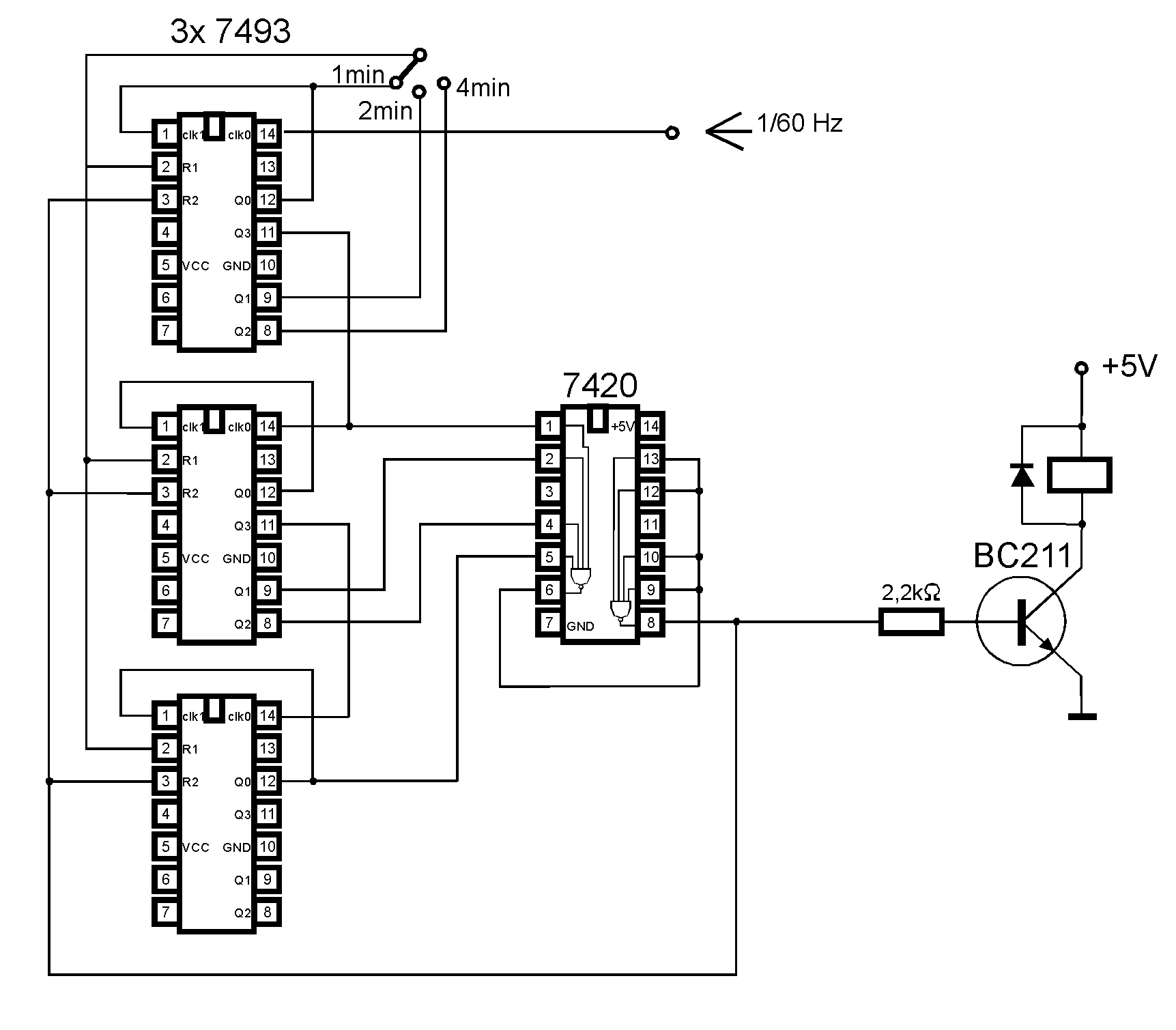 Jest to najprostsze rozwiązanie (jak dla mnie), na bazie tego można zamienić 7430 komparatorem i przełącznikiem sterować długość cykli, czas otwarcia zaworu można zmienić na 2 lub 4 minuty.