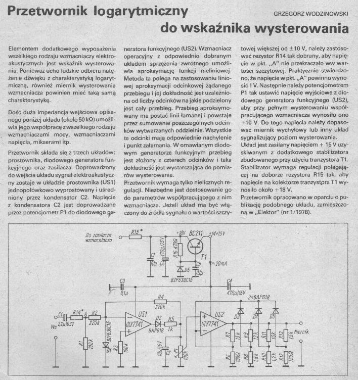 Po kilku godzinach spędzonych w internecie na google.pl powstał, z ogromną pomoca Alka i kolegi studiującego telekomunikację, schemat miernika decybeli. Jest to układ rozwiązujący równianie Uwy = logn( | Uwej | ) / k, gdzie k to stosunek sumy oporów rezystora R i mikroamperomierza uA do oporu samego mikroamperomierza uA.