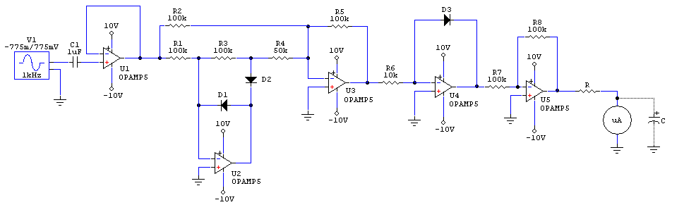 Jak można zauważyć, układ logarytmujący nie chciał działać, ze względu na źle spolaryzowana diodę. Dzielnik napięcia jest konieczny, ponieważ symulacja w CircuitMaker`ze wykazuje, że na wyjściu U5 cały czas panuje napięcie od około 400mV(dla 1mVpp) do 600mV(dla 775mVpp), co oznacza zbyt duży spadek napięcia na oporze cewki amperomierza - cały czas wskazóweczka byłaby wychylona maksymalnie. Mój amperomierz ma opór okolo 1,2k a wskazówka wychyla się przy okolo 100mV. Kondensator C jest opcjonalny i może podtrzymywać wskazóweczkę, aby nie drgała przy graniu niższych czestotliwości, ale myślę, że indukcyjność samej cewki amperomierza temu już zaradzi. W sobotę zrobie PCB i zobaczę jak układ działa, symulacja pokazuje, że osiągnałem to co chciałem. Jeśli widzicie jakieś błędy bardzo prosze napisać!