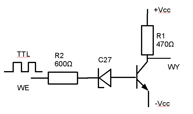 Zrobiłem taki układ jak na rysunku. Na wejście podaje sygnał TTL o częstotliwości 2MHz na +Vcc podaje +24V jeżeli na -Vcc podam około -21V to traznzystor zacznie się przełączać i na wyjściu będzie raz +Vcc a raz -Vcc. Problem jest w tym że jeżeli traznystorem jest BC547 to układ działa prawidłowo ale do częstotliwości ok 30kHz jeżeli dam tranzystor BC141 to wyciągne ok 70 kHz a przy tranzystorze 2N3553 około 300 kHz. Troche to za mało bo ja potrzebuje na wyjściu 2MHz. Czy ktoś wie jak można by to zrobic inaczej lub poprawić cos w tym układzie.