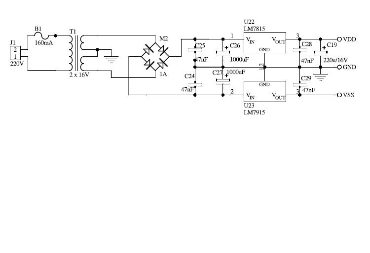 U22 - stabilizator napięcia dodatniego (Vdd); utrzymuje stałe napięcie na wyjściu (Uwy = +15V) niezależnie od obciążenia układu i wahań napięcia wejściowego (Uwe), przy czym Uwe > Uwy,
