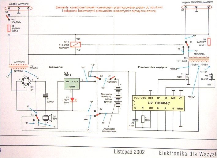 Zawsze myślałem, że przetwornica napięcia 12VDC - 230VAC - to przynajmniej 'ciut' skomplikowany problem. Aż wczoraj trafiłem na artykuł, ze schematem, jak w załączniku. Co prawda to jest UPS, ale... co za różnica
