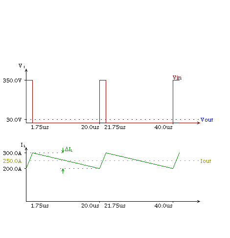 4. W załącznikach zamieszczam przykładowy rysuneczek przebiegu prądu przy założeniach 350V na wejściu 250A/30V na wyjsciu. Jak widać indukcyjność wcale nie będzie tak duża jak podajesz - to zaledwie kilka uH !!! No i prądy w przetwornicy Buck są większe niż prąd wyjściowy - wcale nie owe 255 A tylko jak widać co najmiej 300A. Faktycznie, można zmniejszyć tętnienia prądu wyjściowego znacząco zwiększając indukcyjność i uzyskując mniejszy prąd maksymalny w indukcyjności, ale: po pierwsze większa indukcyjność przy tak dużym prądzie to coraz większe (kosmiczne) rdzenie a po drugie - coraz większa energia zgromadzona w indukcyjności, a nie ma co z nią zrobić przy gwałtownym zaniku obciążenia (nawet jeżeli gwałtownie wyłączymy tranzystory, to i tak energia przecież jest już właśnie zgormoadzona w rdzeniu).