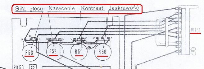 ... to tutaj: Regulacja - schemat.jpg no i widać że te prostokąciki z "wbitymi czarnymi strzałkami" to to samo; R50, R51 itd. Nawet tak samo podpisane: [Nasycenie] [Kontrast] Chodzi o to że szukasz na schemacie po oznaczeniach tego co masz na rysunku "Elementy.jpg"