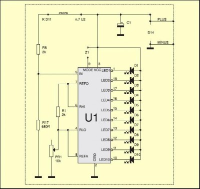 zamieszczony schemat jest to wskaznik napiecia akumulatora na płytke unuwersalna z avt pw-02 i prosiłbym o pomoc poniewarz na tym schemacie chciałebym zrobić wskaznik zasilany napieciem samochodowym czyli od 12-14,4v ale zeby wskaznik pokazywał napiecie w zakresie od 1,5-5v