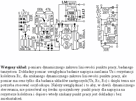 Mało jest przykładów dla dynamicznych pomiarów i taki sensowny do tego układ podałem. Sam układ jest nastawiony na wstępny pomiar liniowości dla par komplementarnych, czyli dla tranzystorów sterujących i decydują o tym tylko zastosowane rezystancje kolektora (Rc=240R---20R) Rc=150R, Rc=50R, Rc=10R -ten zakres pomaga zorientować się jaki jest w ogóle maksymalny zakres liniowej dynamiki tranzystora małej mocy i średniej mocy do prądu Ic=700mA. Można wykorzystać sterowanie tym układem i badać wszystko zmieniając tylko dla tranzystora Rc i Uz. Uwaga tylko rezystory szeregowe bazy (Rbs=775R---Rbs=3.3k) pozwalają na prawidłowe pomiary, początkowych prądów liniowego sterowania się. Najogólniej taki układ pomaga jednoznacznie i w dziecinny i prosty sposób projektować różne audio schematy i dzięki temu dodatkowo ile poprawnych i różnych schematów może pokazać się na forach. Większość obliczonych stopni kl.A jest nie czysto i są przeciążone obciążeniem i w ten sposób kompensowana jest liniowość odstrojonej kl.A i dla tego nazywa się je nie czysta kl.A. Dla czystej kl.A rezystancja obciążenia jest 20x większa od Rc i więcej. Nawet w połączeniach stopni w sposób galwaniczny stosuje się Rc=13.33x min.=Rbs(rezystancja szeregowa bazy).
