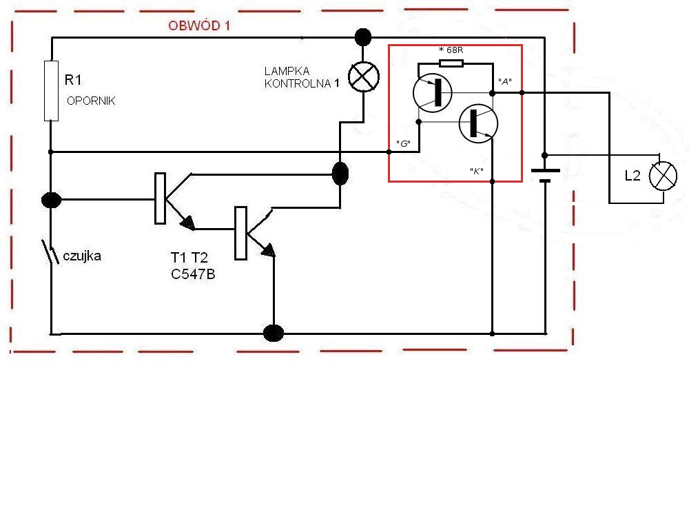 Następnie Statyk narysował podobną postać tranzystorów pełniących funkcję tyrystora lecz jego połączenie nie jest właściwe gdyż punkt "A" tzw anoda powinna być podłączona do emitera PNP czyli po drugiej stronie rezystora 68?Ohm ponieważ tylko wówczas można spolaryzować tranz. PNP który będzie działał jako podtrzymanie dla NPN. Idąc dalej następny problem to gdy styk kontaktronu zostanie ponownie zwarty wtedy rozłączy tyrystor i nici z podtrzymania. Jak i w poprzednich pomysłach z przekaźnikami gdy nie zostanie zwarty kontaktron nie zresetujesz drugiego układu. Inaczej jest już z transoptorem to rozwiązanie ma już racje bytu akurat w tym przypadku. Lecz pozostaje jeszcze sprawa z rozłączeniem podtrzymania