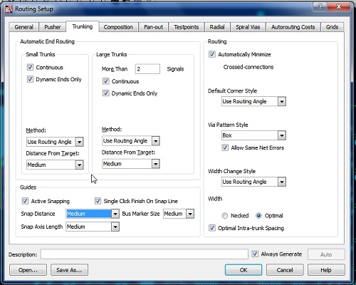 Nie wiem, na czym polega ten problem. Program po skonfigurowaniu w 3 pierwszych zakładkach działa, tak jak się tego wymaga, a trasowanie magistral przebiega sprawnie, choć w zależności od wydajności komputera trzeba poczekać, aż program sam wytrasuje zakończenie magistral czyli rozprowadzi ścieżki z magistrali do padów końcowych. Oczywiście mówię tu o module P.R. Editor, choć w 12.1 moduł Embedded router ma podobną konfigurację w tym oknie.