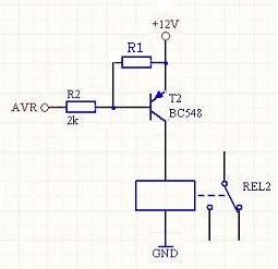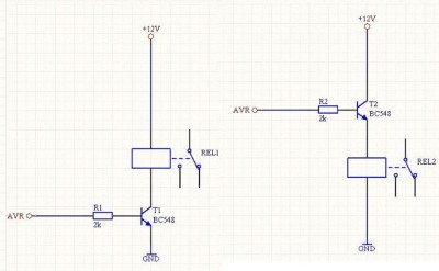 Tranzystor sterowany jest z mikrokontrolera AVR zasilanego 5V. Cewka przekaźnika 12V.