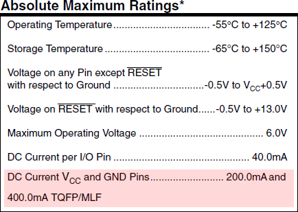 Dla wersji TQFP lub MLF jest 400mA:Zacznijmy od tego, że sumaryczny prąd przekracza 200mA...