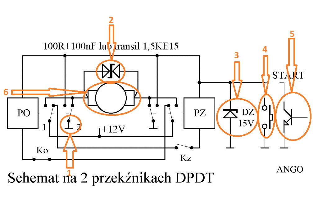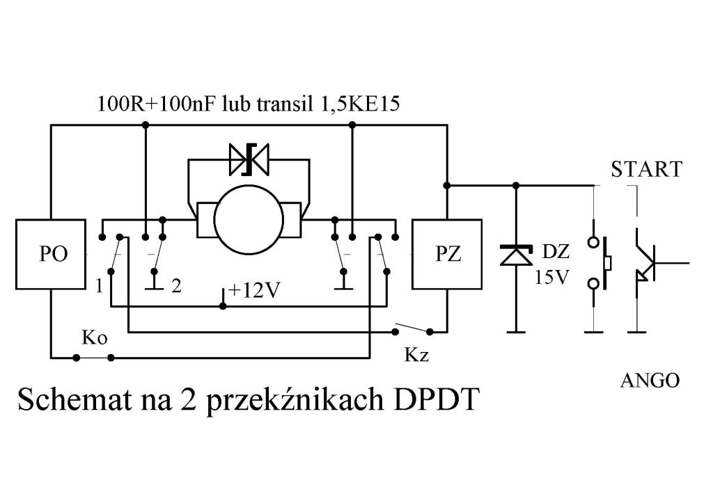 Takie coś zrobiłem kiedyś do bramy. Warunek: po dojściu do danego skrajnego położenia odpowiednia krańcówka musi się rozwierać. Przyciskasz przycisk na chwilę, odpowiedni przekaźnik załapuje i sam się podtrzymuje do czasu, aż go rozewrze druga krańcówka. Oczywiście, Zenerkę ( była na wszelki wypadek by chronić wyjście OC zdalnego sterowania ) można usunąć ale RC lub transila w pinach silnika radzę zostawić.