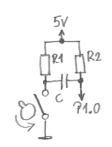 Popatrzmy oczami kondensatora :): Na obu okładkach jest 5V, bo jest naładowany przez rezystory. Po zwarciu ma nastapić zero(cały ładunek ucieka z okładki do masy przez styk), więc przyjmę, że stanie się to w tym samym momencie co zwarcie - brak oporu styku - ogólnie bardzo stromy przebieg(nawet nie obchodzi nas ile to bedzie trwało - obchodzi nas tylko okres kiedy potencjał na P1.0 jest poniżej 0,5V). Zaraz po tym, kond zaczyna się ładować się na nowo. Znając przebieg wiemy, że z początku bardzo szybko potencjał rośnie, a dopiero potem zwalnia, my chcemy, aby ten potencjał poniżej 0,5V trwał jakiś dłuższy okres czasu(taki aby proc zdążył zauważyć, że jest 0), więc można przyjąć nawet, że poniżej 0,5V odpowiada 1/100 czasu ładowania sie konda do "pełna" - czyli do 5V. Chcę aby zero trwało: