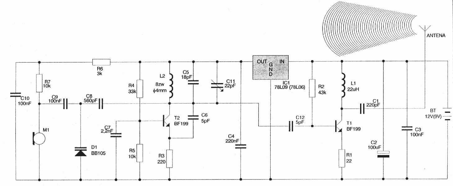 jeszcze raz załącznik :D ten drugi tranzystor(nadjnik na 9V) spełnia role wzmacniacza wielkiej częstotliwości.Można go nie robić i podłączyć bespośrednio C12 do anteny.