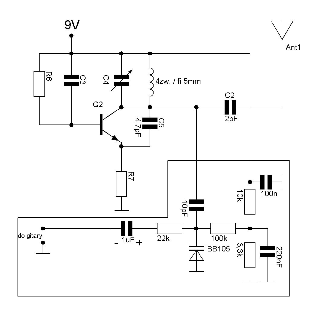 Witam! Ten drugi schemat, co Kolega Sava pokazał, to przecież pracuje z modulacją częstotliwości, z tym, że to jest sam generator, brakuje tam modulatora, i nie ma kolego znaczenia, czy to jest do sterowania modeli, nadajnik jest nadajnikiem, fakt faktem, że do takiego zastosowania, jakie kolega oczekuje, to zbytnio się to nie nadaje. Przede wszystkim, częstotliwość musi być bardzo stabilna, to wiadomo, najlepiej na kwarcu, ze względu na dość szerokie pasmo akustyczne gitary, modulator musi chodzić dość głęboko, czyli szeroko, po generatorze powinien być jeszcze jeden stopień, żeby antena nie miała wpływu na zmiany pojemności generatora i zarazem pracuje to jako wzmacniacz i antena bezpośrednio nie obciąża generatora. Jak długo żyję, to raz spotkałem w kicie trochę lepszy, ale to chyba wycofali, ale mam schemat, przerysuje i postaram się to wrzucić tu na forum.