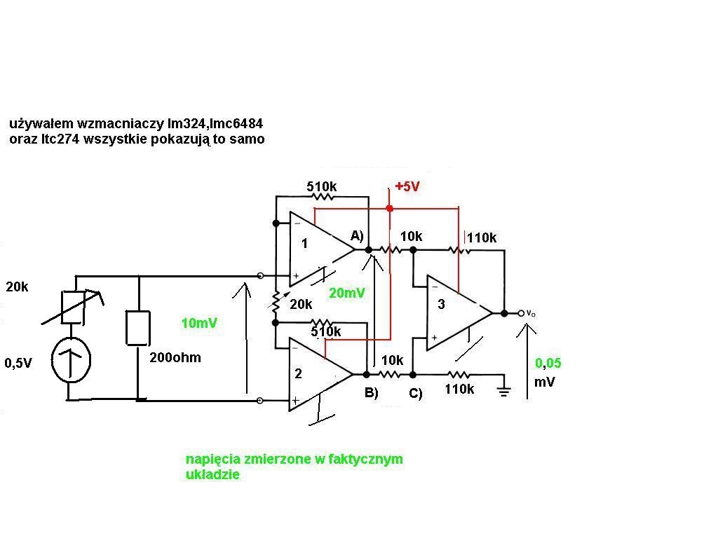 Pomocy mam problem złożyłem wzmacniacz taki sam jak w książce zgodny z nota techniczna wzmacniacza LMC6484 i zamiast wzmocnienia 1000 na wyjsciu otrzymalem wzmocnienie nawet nie 2 a wedlug wzoru: