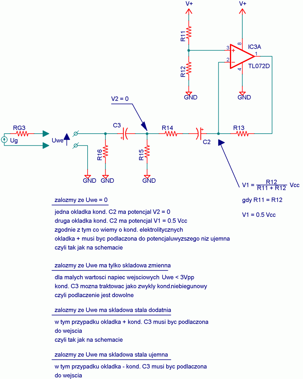 Popztrzcie na schemat. Sa tam dwa kondensatory elektrolityczne. I chodzi o to dlaczego akurat elektrolity. Jeżeli podam sygnał taki jak na przebiegu nr 1 czyli przyjmujący wartości od +1V poprzez 0 aż do -1V (wartość przypadkowa może być większa) to przecież kondensator C3 jest na przemian polaryzowany raz dodatnio a raz ujemnie.