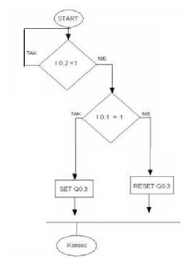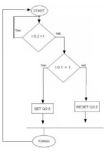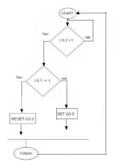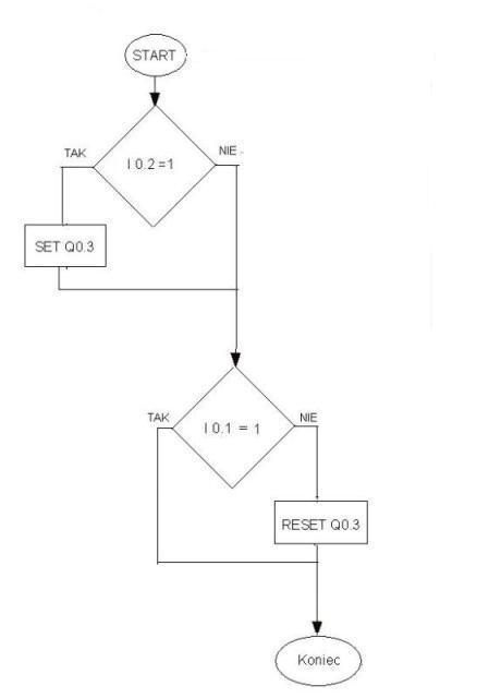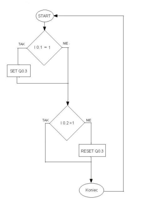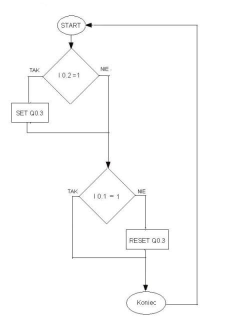 To narysuj jak wedlug Ciebie powiniem wyglądać algorytm bo ja nie rozumiem tego, nie wiem jak to narysować . Według mnie gdy na I0.2 jest jedynka wtedy jest przcisk w stanie swobodnym czyli nie jest wciśniety bo są to styki NC czili nic sie nie dzieje w układzie nawet gdyby wcisnac przycisk Io.2 to i tak nic sie nie będzie działo bo nie bedzie mial co gasić wiec musi iść do początku programu to jak narysowałem . Jeśli przycisk zielony jest wciśnięty czyli wystepuje na nim stan 0 to program sprawdza stan na przycisku czerwonym jesli jest na nim 1 to stan na wyjsciu Q0.3 jest ustawiany taki jak poprzedni stan czyli żarówka dalej świeci. Natomiast jeżeli na wejsciu Io.2 na przycisku czerwonym jest stan 0 to przycisk czerwony jest wciśniety.Powoduje to zgaszenie żarówki co powoduje zresetowanie poprzedniego stanu ( skasowanie) . I po program idzie do startu i obdywa sie to tak samo jak podałem wyżej.