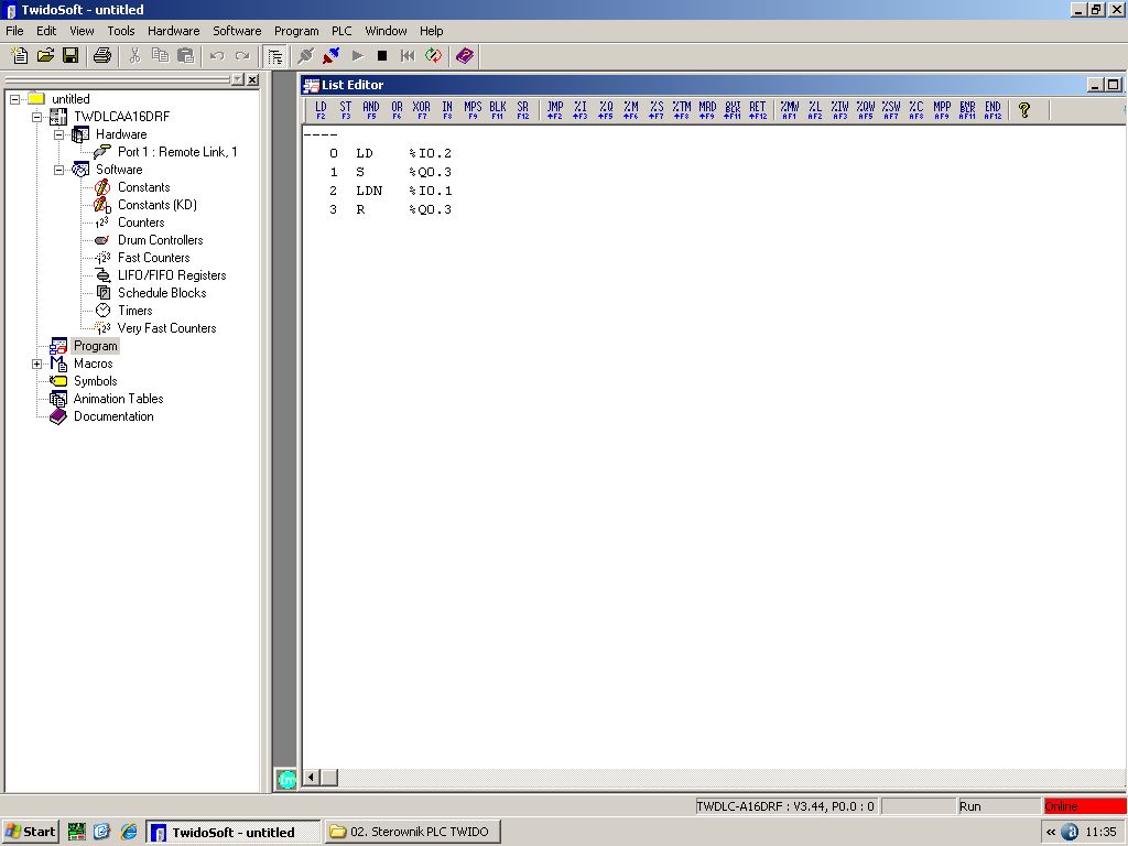 Dzięki ale listingu ktory napisałem napewno jest dobrze bo sam program Twinsoft mi go automatycznie napisał ja tylko narysowałem w języku drabinkowym ten program i po podłączeniu steownika PLC do komptera i po wykonaniu odpowenich operacji w programie Twinsoft program mi dziłał gdy naciśnołem zielony buzik świeciła żarowka gdy nacisnełem czerwony gasła . Prosze narysować jak bedzie wyglądał algorytm dla mojego listingu patrz poniżej