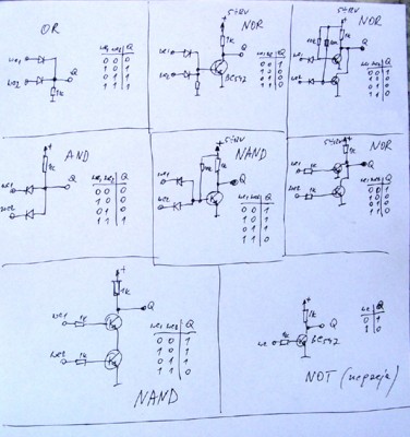Takie podstawowe układy logiczne (bramki) można zrealizować za pomocą rezystorów, diod i zwykłych tranzystorów, tak jak to napisałem w poprzednim poście