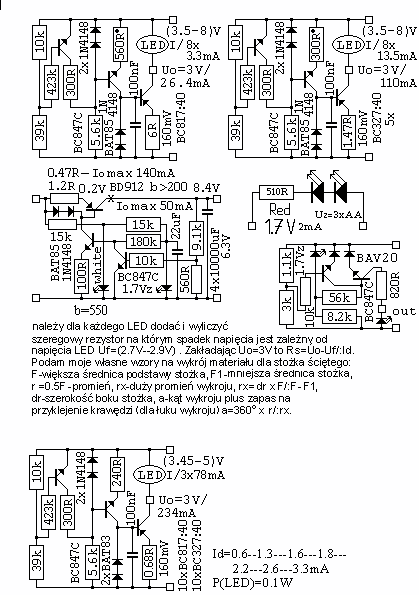 Są tanie i nie tanie LED latarki i jedynie samemu można przerobić tanie i nowe latarki, które mają nowe i nie spalone LED. Latarka domowa na LED nie może mieć za mocne światło bo jest za kontrastowo wstrętne światło i źle oświetla pomieszczenia mieszkalne i drażni oczy i pobiera duży prąd i jasność świecenia takiej latarki dosyć szybko maleje, a praktycznie zasilanie na baterie mija się z celem. Następną sprawą do wyjaśnienia jest prąd LED przy którym świeci ona 100tyś.godzin i po tym czasie siła światła spada o połowę i np. takim prądem dla LED P=0.1W jest Id=1.8mA i proporcjonalnie to samo odnosi się dla LED większej mocy. Podam ciekawe i trochę większe prądy dla nowych LED P=0.1W: Id=2.2mA lub Id=2.6mA oraz największy prąd Id=3.3mA -z konieczności. Takie małe prądy wymagają dużych i dobrych luster oraz ich ilość np. 8sztuk i takie są tanie i stare i duże latarki na akumulator żelowy. Podałem załącznik ze schematami jak zasilać LEDy w latarkach i nie jest to proste aby latarka świeciła jednakowo jasno aż do chwili wyładowania się baterii. Podałem także cenny schemat zasilacza wstępnego zasilanego z dynama rowerowego poprzez prostownik diodowy i wiadomo jest zasilany napięciem stałym pulsującym i posiada funkcję magazynowania światła na czas 10sekund świecenia światła przedniego i tylnego, po nagłym zatrzymaniu się roweru. Można przewinąć dynamo rowerowe cieńszym drutem i nawinąć więcej zwojów np. 1.7x lub 2x i wtedy idąc poboczem drogi światła świecą pełną mocą, jak dla dzieci jest to trochę cudów elektronicznych, a zasilanie tylko z baterii też ma sens, bo wtedy czas pracy wynosi 20godzin tak samo jasnego światła. Myśląc o rowerze trzeba przykleić szybkę (pokrywka z płyt CD) butaprenem i okleić LEDy z lustrem aby zapewnić hermetyczność i niezniszczalność lustra na wodę. Zasilanie LED źródłami prądowymi ma dużą dokładność i oszczędność dla zasilania 3xAA i dla baterii i dla akumulatorów, ale czasem może okazać się potrzebna specjalna regulacja. Także są podane dwa różne wskaźniki zużycia baterii. Można zrobić latarkę optymalną dla mocy świecenia i długiej żywotności LEDów dla LED P=1W /95Lm, typ: SG LA140S01L i zastosować je w liczbie 8sztuk i każda LED ma prąd Id=13.5mA, co daje w sumie około Io=110mA i jest to jeszcze dobry prąd i dla długiej żywotności użytkowania samych akumulatorów. Miejsce mocowania LED do lustra potrzeba podciąć czołowym frezem np.średnicy f=5mm (przynajmniej ściąć plastikowy kołnierzyk).