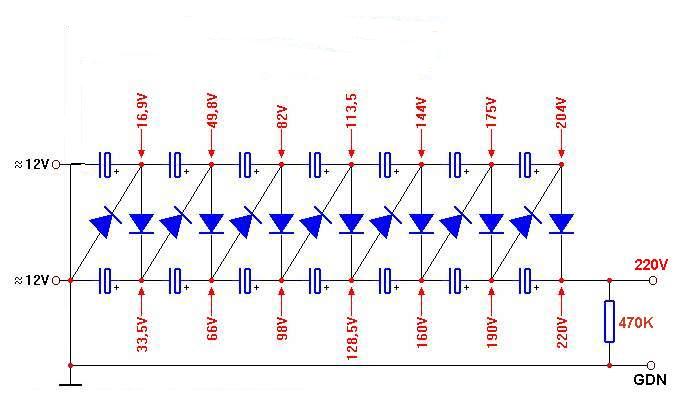 - albo zmniejszyć ilość diod i kondensatorów do siedmiu (i wtedy wykorzystać dolny łańcuch kondensatorów, na którym jest 3 * 2 napięcia szczytowe + 1 * napięcie szczytowe = 7 * napięcie szczytowe)