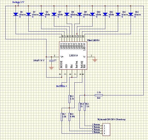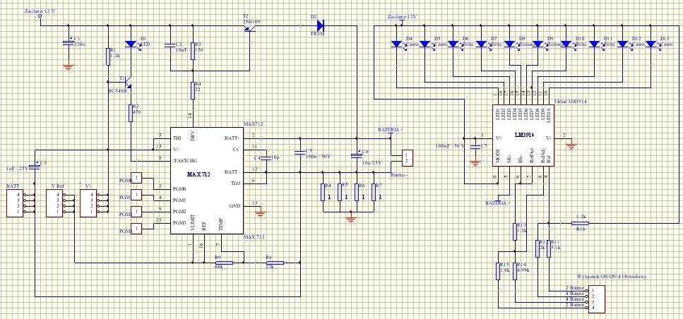 jeszcze zrobiłem do tej ładowarki wskaźnik naładowania baterii na układzie LM3914 więc dołączę go do schematu bo nie mam całkowitej pewności czy wszystko dobrze zrobiłem więc jeśli koledzy mogą sprawdzić również bardzo wdzięczny byłbym