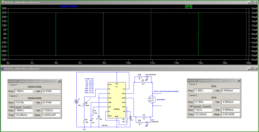 Zrobiłem symulację i jest OK. Później zmontowałem na płytce montażowej i też OK. Zacząłem elektrolizę i byłem zaskoczony, bo trwała ponad 11 godzin. Prąd elektrolizy wzrastał co godzinę o ok. 0,3 mA - 0,5 mA, częstotliwość generatora 0,1 Hz, woda destylowana 0,7 l no i lekkie mieszanie wody.