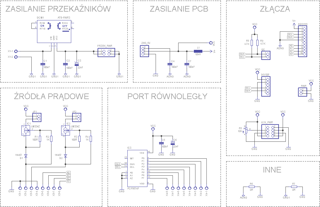 Na schemacie znajdują się dwa bloki zasilania o nazwach zasilanie przekaźników oraz zasilanie PCB. Podział ten przeprowadziłem po to, aby zrobić osobny obwód zasilania projektowanej płytki oraz niepokazanej na schemacie płytki z przekaźnikami (cewka 5 V). Oba bloki są zasilane z jednego zasilacza, który jest podłączony bezpośrednio do Arduino oraz do złączy pokazanych w bloku zasilanie PCB. W obwodzie zasilania przekaźników zdecydowałem się na zastosowanie przetwornicy Atnela PWR-3, ponieważ na osobnej płytce jest 8 przekaźników, a cewka pojedynczego przekaźnika potrzebuje ok. 71 mA (w przeprowadzonych testach wyszło, że nieznacznie ponad 80 mA). Oznacza to, że potrzeba przynajmniej 640 mA na obsługę przekaźników. Z tego co wiem, to zastosowanie zwykłego LM7805 przy tego typu zapotrzebowaniu na prąd wymaga zastosowania radiatora, a tego wolałbym uniknąć.