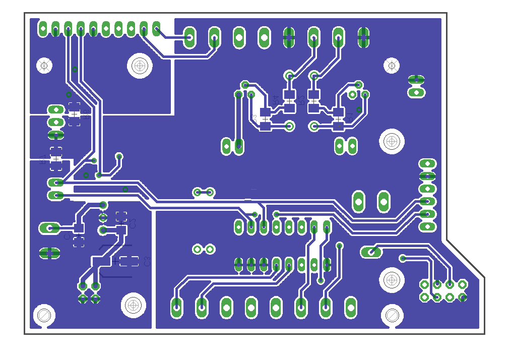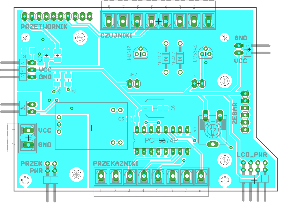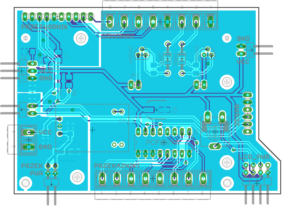 Pewnie można byłoby to zrobić na płytce jednostronnej, ale ja po początkowej próbie zaprojektowania płytki tylko na jednej warstwie uznałem, że łatwiej będzie to zrobić za pomocą dwóch warstw. Przyznam, że przy moim braku doświadczenia i jednocześnie stosunkowo małej liczbie elementów przewlekanych, za pomocą których mógłbym przechodzić nad ścieżkami trudno mi sobie wyobrazić płytkę jednostronną.