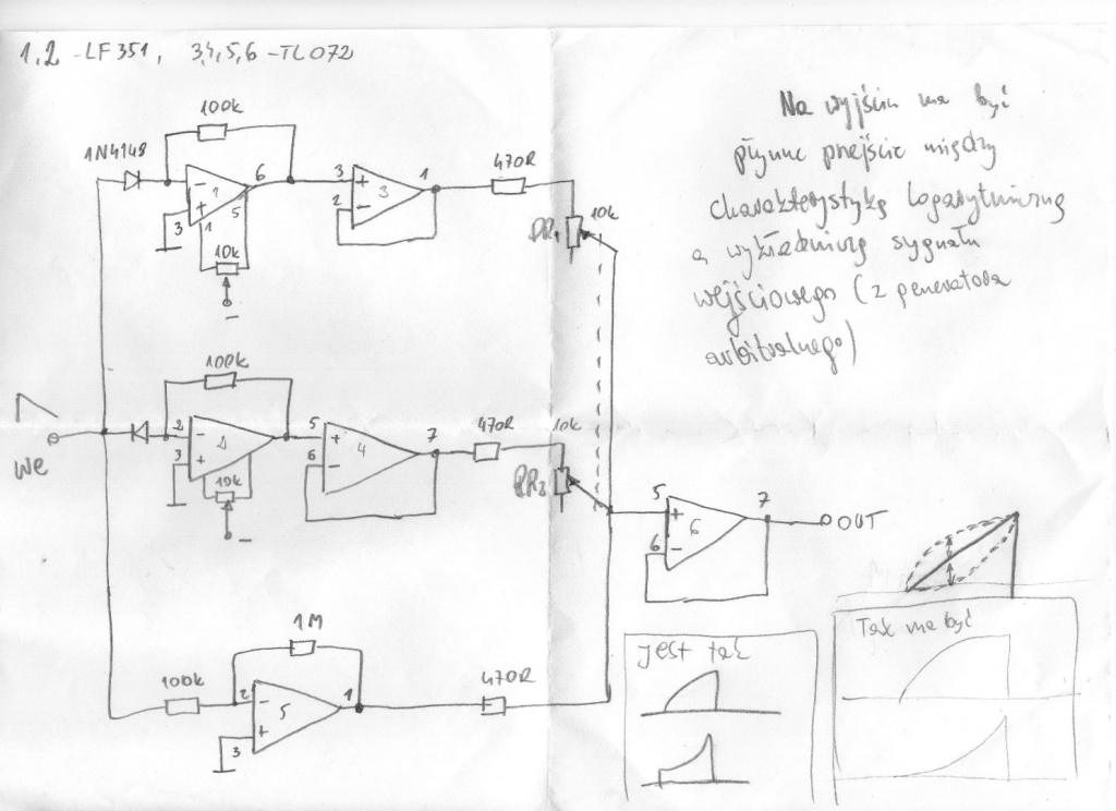 Chodzi mianowicie o to, aby stworzyć układ, który mógłby przy pomocy potencjometru, płynnie z przebiegu piło-kształtnego podanego na wejście, otrzymywać charakterystykę od logarytmicznej do wykładniczej.