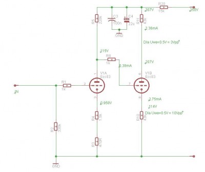 Witam.Zrobiłem inwerter z dzielonym obciążeniem na Ecc83 według schematu poniżej. Zrobiłem też symulacje w pspice i wynika że wszystko jest oki - sygnał odwrócony w fazie z tą samą amplitudą. Problem polega na tym że amplituda sygnałów w rzeczywistym układzie jest różna - na katodzie V1B -10V a na anodzie V1B- 3V , dla 0.5V na wejściu. Zmianiając wartość opornika na katodzie V1A zmieniam poziom sygnału na jej anodzie, a z tym poziom sygnału na anodize i katodzie VB2 - jednak przy ustawionym napięciu na anodzie VA1 = ok 20V na katodzie V1B mam ładny sygnał, natomiast na anodzie V1B sygnał obcinany jest od dołu. Męcze się z tym ukłądem juz z 2 tygodnie i nie wiem co jest nie tak. Bede wdzieczny za pomoc.