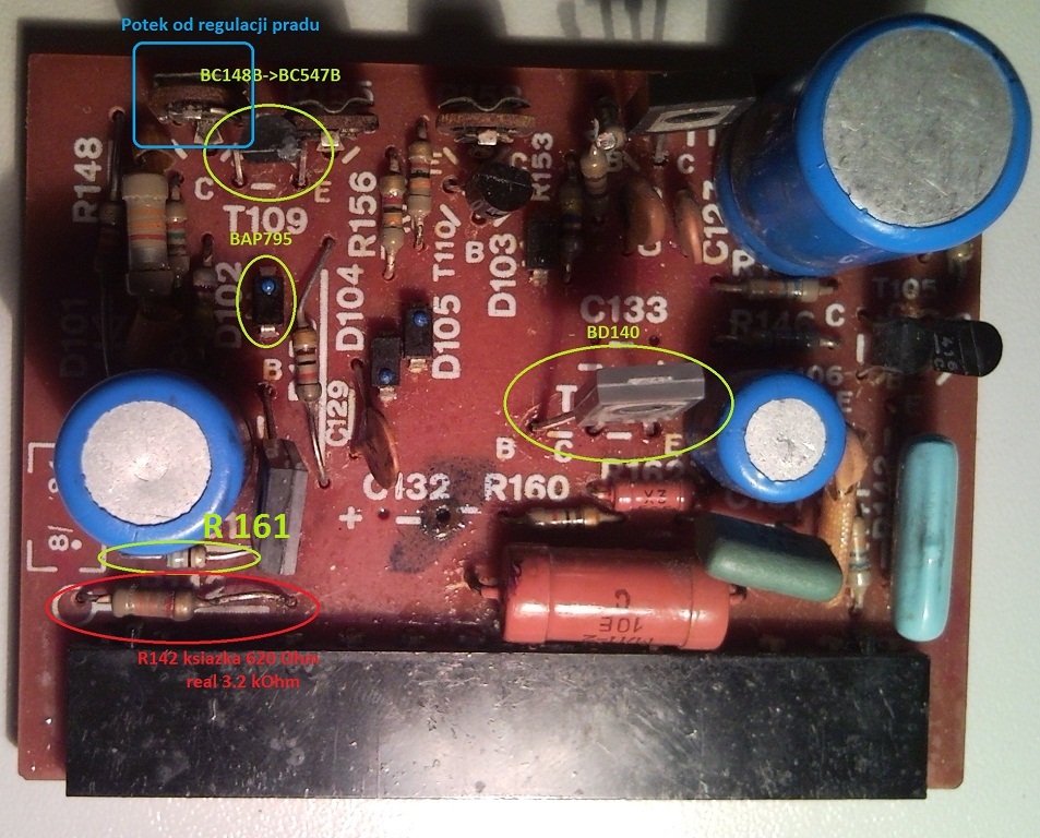 Pomierzyłem wszystko, powymieniałem, wszystko sie zgadza poza jednym opornikiem który oznaczony jest R142 w książce serwisowej znalazłem Rezystor RMB 0,5W 620 Ohm 5% zaś na obu płytkach od kanałów wlutowany jest opornik 3,2 kOhm (wyglada jak OWZ ale az tak bardzo się na tym nie znam). Jednakże jeden kanał działał wiec tym się nie przejmowałem, dopóki nie regulowałem pradu spoczynkowego i mi popaliło elementy.