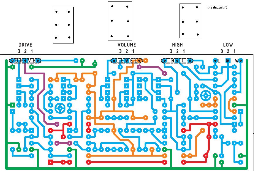 Budowa efektu dobiega końca ale natrafiłem na spory problem a mianowicie kupiłem przełączniki i niewiem jak je podłączyć. W załączniku jest schemat płytki z narysowanymi przezemnie przełącznikami jake posiadam i tu moja prośba czy mógłby mi ktoś narysować (najlepiej różnymi kolorami) jak mam lutować przewody (z jakiego miejsca w płytce do której nóżki przełącznika)