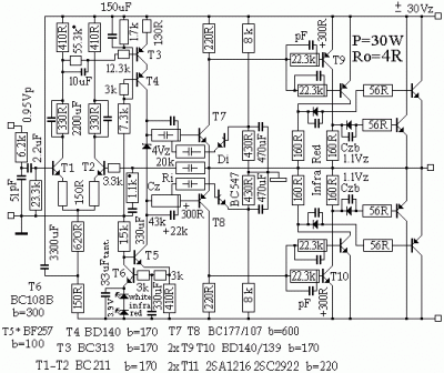 Sam myślałem aby coś takiego zrobić 2x30V/4R i aby zastosować dynamiczną stabilizację prądu spoczynkowego i taka moc P=30W i jakość starczyła by w domu całkowicie. Ten prąd spoczynkowy dużo w wzmacniaczach psuje i tym bardziej to słychać jeśli wzmacniacz jest nie tak dokładnie złożony. Czasem można to prosto sprawdzić i podać na wejście wzmacniacza prąd sinusoidalny powyżej 20kHz i okazuje się duża słodkość wysokich tonów i wtedy trochę jakby to zrobił się wzmacniacz lampowy, a różnica jest duża. Stosuję małe rezystancje wyjściowe ponieważ nie lubię aby coś specjalnie się załączało z kosmosu na chłodzenie cewek w głośnikach i czasem razem z tym występuje ogłupianie słuchających muzyki ludzi, bo nic jest za darmo. Myślę lepiej jest pokombinować zrobić mniejszą moc na ileś tam kolumn głośnikowych i jak dawniej moc impulsowa P=6W wzmacniacza lampowego starczała na jeden głośnik aby go nie uszkodzić i nawet to nie może być moc ciągła. Obecnie moc ciągłą na głośnik podają raczej jako sprawdzenie resorów głośnika i programu z kosmosu aby głośnik się nie spalił. Dlatego moje małe kolumny głośnikowe, których schemat podałem wystarczają, bo są tanie i mają po dwa głośniki niskotonowe w jednej kolumnie, co daje na taką kolumnę moc impulsową P=12W, czyli na moc impulsową P=60W potrzeba ich 5sztuk i można sobie spokojnie pogrywać ile się chce. Dla małego obciążenia wzmacniacza można stosować tanie głośniki samochodowe np. DY-509 lub podobne. Dziwię się jeden głośnik np. Rg=8R dla dużej mocy nie może działać bez zniekształceń, chyba że też działa na niego specjalny program i dlatego takie głupie rzeczy niby nie są głupie. Jeśli czasy się zmieniają to będą grały tylko same membrany a potem nawet tylko sam program z kosmosu nagłośni pomieszczenie, nie wiem czy dzieci lubią takie czary. Dla zaspokojenia ciekawości podaje nowy schemat jaka jest tej techniki różnica pomiędzy wzmacniaczem małej rezystancji obciążenia i o typowej. Jeśli ktoś ma tr.mocy liniowe Ic=2.2Ap o wzmocnieniu b=220 to taki wzmacniacz jest realny. Tranzystory T7 i T8 powinny mieć liniowy prąd kolektora do Ic=16mA i nie jest to za duże wymaganie, po prostu trzeba selekcjonować. Stopień napięciowy jest wrażliwy i zawsze się go dobiera nawet bez obciążenia i z zamkniętym sprzężeniem zwrotnym aby był symetryczny poprzez dobór typu tranzystora T5. Z tego względu nie są to za łatwe wzmacniacze. Odnośnie sprzężenia zwrotnego i bez to raczej czyste sprzężenie zwrotne na węzłach i czystym zasilaniu zawsze jest korzystne. Można oddzielić zasilanie tr.mocy od reszty wzmacniacza stosując podwójny dławik toroidalny z podwójnym filtrem kondensatorowym, czyli zastosować na dławikach podwójną filtrację napięcia zasilania, tym bardziej jeśli zasilacz nie jest najwyższej klasy, ale zawsze musi być stabilizowane napięcie. Dławiki są niskiej rezystancji czynnej i dobre na rdzeniach toroidalnych.