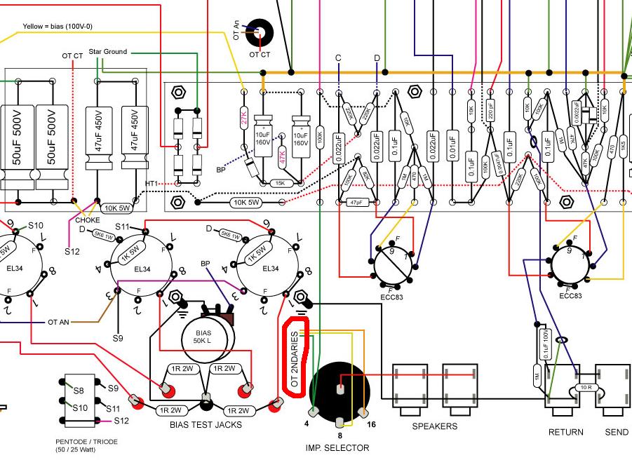 Moim zdaniem chodzi o uzwojenia wtórne transformatora wyjściowego (output transformer - secondaries). Zielony przewód - do odczepu wyjścia 4-omowego, żółty - do odczepu wyjścia 8-omowego, i pomarańczowy - do wyjścia 16-omowego.... Co to takiego OT 2ndaries? ...