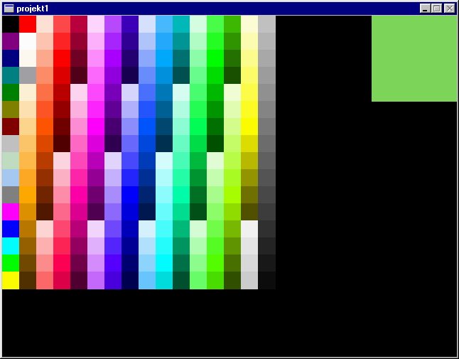 // a tutaj rozpoczynamy porównywanie... for (int i = 0; i < 256; i++) { suma_roznic = abs(kolor.r - paleta[i].r) + abs(kolor.g - paleta[i].g) + abs(kolor.b - paleta[i].b); // jeśli suma różnic aktualnego koloru palety i koloru podstawowego jest // mniejsza od wcześniejszej sumy, to aktualny kolor jest podobniejszy if (suma_roznic < poprzednia_roznica) { // zapamiętujemy najmniejszą różnicę... poprzednia_roznica = suma_roznic; // ...i rysujemy podobny kolor :) rectfill(screen, 400, 0, 519, 120, makecol(paleta[i].r * 4, paleta[i].g * 4, paleta[i].b * 4)); } }