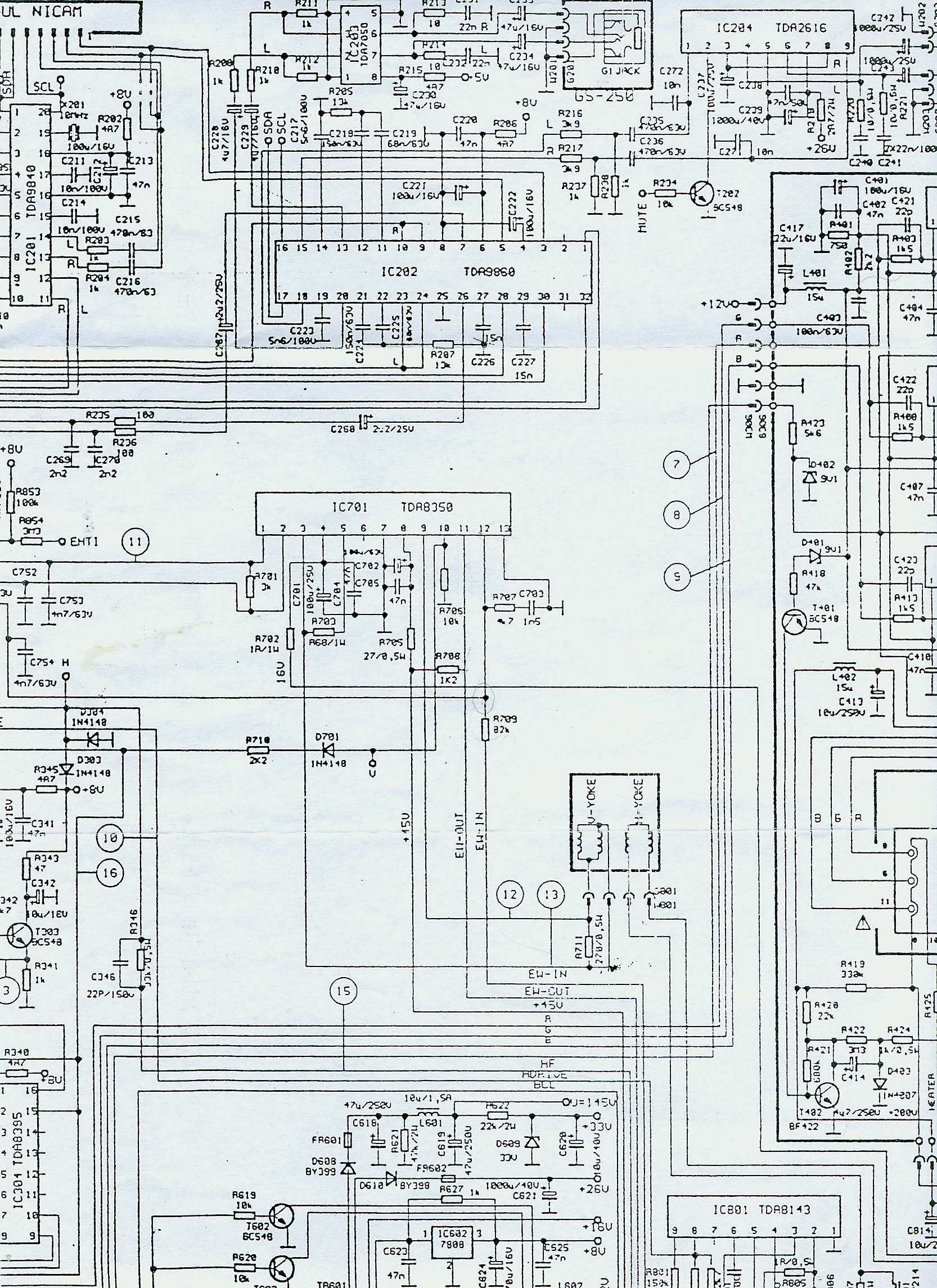 Witam wszystkich! Zwracam się z uprzejmą prośbą w sprawie tytułowego triluxa. Mianowicie jaki problem zaistniał: telewizor zgasł, dobierając się do niego zauważyłem, że kondensator C811 o wartości 1mikro poprzez źle wlutowaną nóżkę się przepalił. Na jego miejsce został wlutowany dobry kondensator o takich samych parametrach. Udało się włączyć telewizor. Wystąpił drugi problem z odchylaniem poziomym. Telewizor działa, ale obraz jest z lekka powiększony i spłaszczony z góry i z dołu. Wymienione zostały niektóre układy (wydawało nam się że one były za to odpowiedzialne), niestety nie zmieniło to sytuacji. Włączyłem tryb serwisowy w celu próby ręcznego ustawienia odchylania poziomego, okazało się jednak że odchylanie H nie reaguje na ustawienia. Sprawdziłem reakcje innych ustawień i wszystko działa oprócz odchylania poziomego. Zmierzyłem również napięcia na TDA8143, TDA8350, TDA8376. Z góry dziękuję za wszelką pomoc.