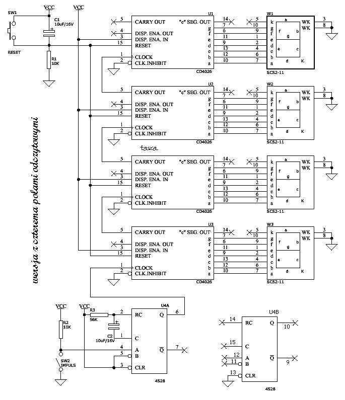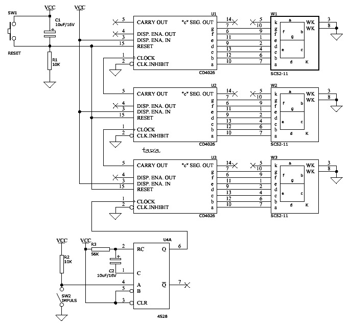 w roli głównej CD4026 do świecenia i liczenia, a 1/2 kości CD4528 jako debouncer...