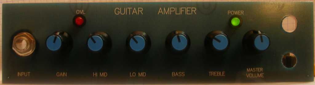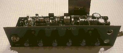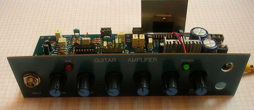 Układ ma dość klasyczną budowę, tj. stopień wejściowy -> czteropunktowa korekcja -> filtry -> końcówka mocy na TDA7293 + wbudowany zasilacz. Wzmacniacz posiada jedno wejście pod gitarę, pętlę efektów, wyjście symetryczne i oczywiście na głośnik oraz kilka innych gniadz. Można na nim uzyskać względnie lekki przester, jednak nie jestem wstanie określić jak naprawdę brzmi. Niestety zmuszony do używania głośnika z gramofonu Bambino + dwóch głośników bocznych od wierzy, które kompletne są "niegitarowe", nie mogę wiele powiedzieć... Clean zaś ma dość ładny i na prawdę z ręką na sercu stwierdzam, że grałem na gorszych wzmacniaczach - np. Laney HC15. Oczywiście brzmienie nie jest moim ideałem, ale trzeba mieć na uwadze, że nie mam profesjonalnej kolumny gitarowej. Narazie wzmacniacz nie ma obudowy, potencjimetry są przymocowane do prowizorycznego płytki z laminatu. Całkowity koszt to nieco ponad 100zł. Nie wiem jeszcze, czy dalej inwestować ten układ (tj. obudowa, głośnik), niedługo zabieram się za budowę lampowca.