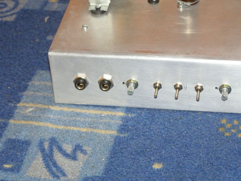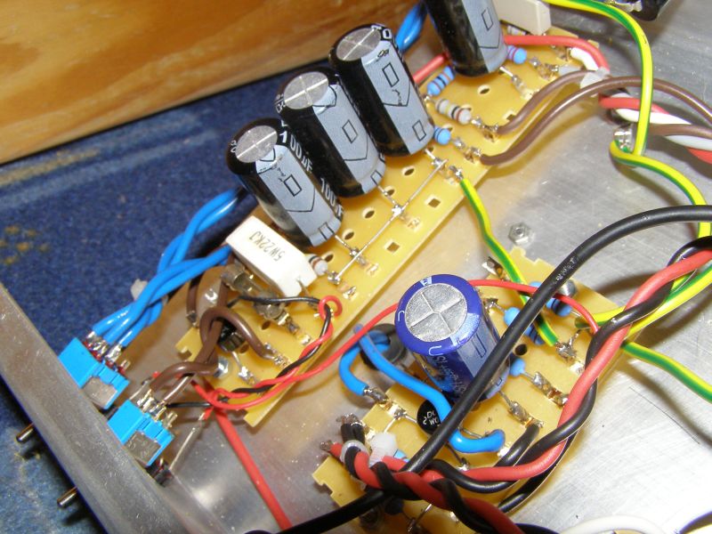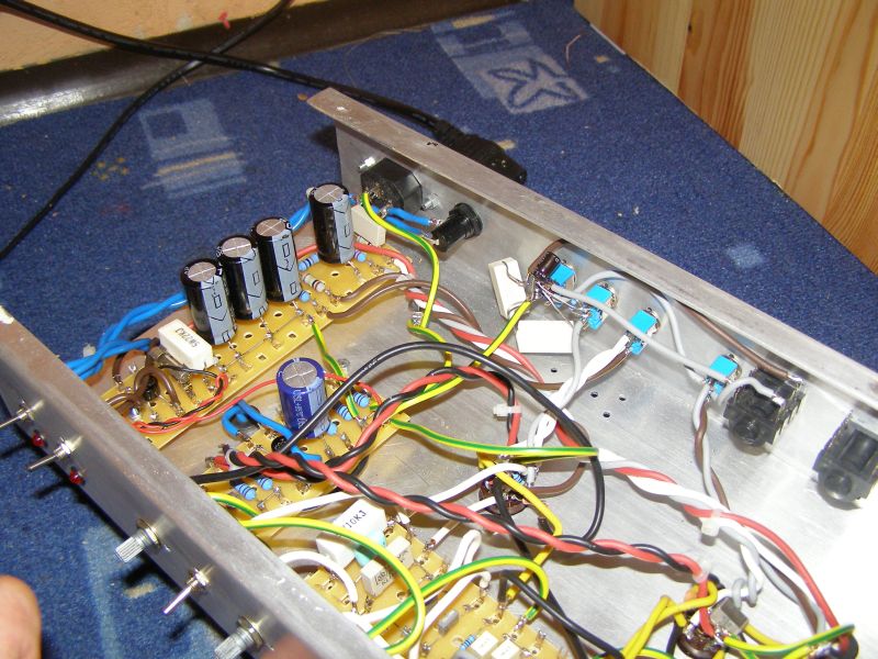 Postanowiłem zmontować wzmacniacz jako mały head. Razem z tatą wygieliśmy odpowiednie chassis z blachy aluminiowej 1,5mm. Z wywierceniem otworków nie było większych problemów, wyszy całkiem równo (szablon drukowany na komputerze). Później nastąpiło składanie poszczególnych części wzmacniacza na listwie lutowniczej - osobno preamp, osobno zasilanie anodowe, osobno zasilanie żarzenia (co zresztą widać na zdjęciach). Wszystko starałem się wykonywać ładnie i schludnie, jak to mam zwyczaj. Po pewnej przerwie zacząłem składać wszystko w całość. Szkoda, że nie miałem możliwości zrobienia wówczas fotek, bo naprawdę ładnie wyglądało chassis z zamontowanymi potencjometremi, gniazdami, przełącznikami i listwami. Teraz wszystko jest w gąszczu kabli i kabeleczków, więc nie ma już tego efektu... Ale trudno. Montować trzeba było. Zdecydowanie najgorsze było łączenie kabelkami. Kabelek, odmierzyć, uciąć, ściągnąć izolację, zakręcić, pocynować, wygiąć, przylutować i tak ze dwieście razy. Mordowałem się z tym i mordowałem. Gdy już zbliżałem się do końca, stało się najgorsze - zabrakło cyny. Niedziela wieczór, co robić? Oszczędzałem ją jak tylko mogłem, jakoś przyspawałem ostatni kabelek kilkoma atomami ostałej cyny. Udało się, wzmacniacz zmontowany, czas uruchomić...