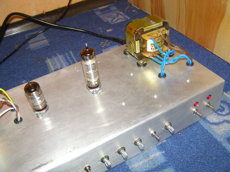 Emocjonująca chwila - pierwsza lampówka, pierwsze uruchomienie... Ryzyk fizyk, podłaczam do sieci. Włączam żarzenie. Jest! Nic nie wybuchło, dioda się świeci, wszystko wygląda OK. Dobra, czas na anodowe. Pstryczek do góry i... nic :-) Nic się nie stało niepokojącego. Zmierzyłem napięcia, zdają być się odpowiednie. Czas włożyć lampy... Proces właczania powtórzyłem, tym razem z lampami. Pierwszy raz zobaczyłem ich błysk, który odrazu mnie uwiódł... Eureka! Pierwsza konstrukca lampowa. Udało się po wielu miesiącach ciężkiej pracy ujżeć żarzące się lampy, cóż za widok! Emocje na bok, czas na test z gitarą. Podłączam 10" głośnik z Roland'a, gitarę i... i buczenie... i bardzo słaby sygnał. Co się dzieje? Wyłączam wzmacniacz, patrzę... No tak! Przecież nie ma gniazda wejściowe nie mają połączenia z masą :-). Po prowizorycznym poprawieniu usterki usłyszałem wydobywające się z głośnia cudowe odgłosy mojej gitary. Cóż za moment, tyle czasu... wreszcie się udało.