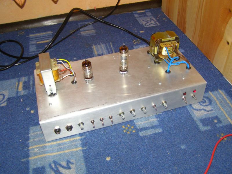 Cześć! Zaprezentuję dziś Wam moją pierwszą lampówkę ;-) Jest to typowa konstrukcja gitarowa przeznaczona do "brzdąkania" w domku, ale może o tym później. Najsampierw przedstawię może nieco owe dzieło. Dwie lampy - ECC83 / 12AX7 / 6N2P-EW / ECC81 w preampie oraz końcówka na ECL86. Trafa jak i lampa w końcówce pochodzą z gramofonu Bambino 3. Transformator sieciowy to TS 30/9/676 zaś głośnikowy to popularny TG 2,5-1-666. Dwa kanały - clean i drive + dodatkowo boost, trzypunktowa, klasyczna Marshal'lowska korekcja, pętla efektów, przełączniki bright, presence, triode/pentode. Wzmacniacz ma moc ok. 3W, więc niektórzy mogą być z dziwieni, jeśli powiem, że dla mnie to za dużo, jeśli chodzi o granie w domu. Na przesterze i 10" głośniku wzmacniacz robi taki hałas, że nie idzie tego rozkręcić na 1/3. Dobrze, że wyposażyłem go w szereg przełączników redukujących głośność i wzmocnienie końcówki. Oczywiście clean jest nieco cichszy, ale spokojnie starcza mocy, by powkurzać sąsiadów...
