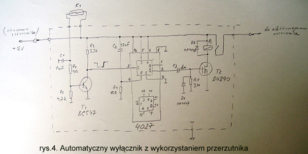 Na rys.4 pokazany jest automatyczny wyłącznik z wykorzystaniem przerzutnika. Jest to pierwotna wersja pomysłu na taki wyłącznik, zmontowana na tekturce i sprawdzona w eksploatacji przez kilkanaście dni. Uznałem jednak, że jest to układ zbyt skomplikowany, i metodą kolejnych uproszczeń powstał wyłącznik taki jak na rys.1