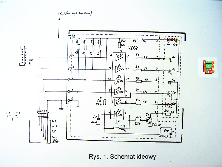 Urządzenie jest bardzo proste i współpracuje z łatwym do zrobienia czujnikiem poziomów płynu, oraz z wyświetlaczem w postaci linijki diodowej, również łatwym do wykonania. Jest także przewidziana regulacja jasności wyświetlacza w zależności od oświetlenia zewnętrznego. Schemat ideowy urządzenia jest pokazany na rys.1, płytka drukowana na rys.2.